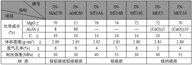 ·JN系列低碳磚、無碳磚主要理化指標·